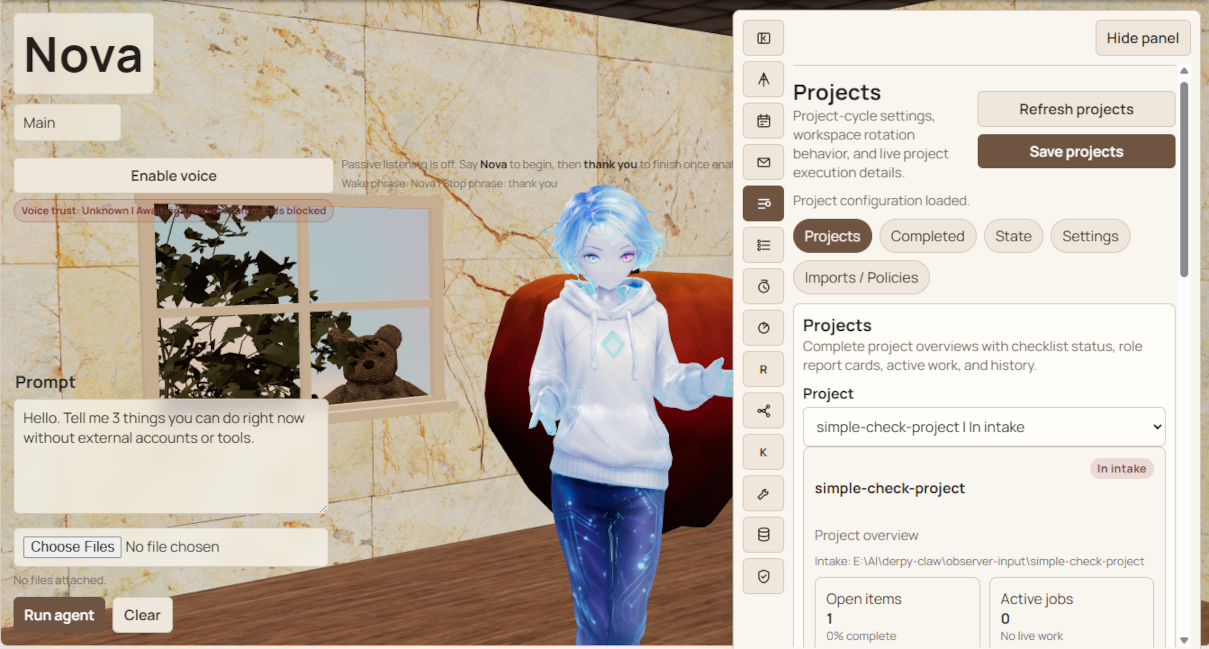 Nova(identity, trust, environment, props, recreation, questions)CalendarMailProjectsQueueJobs(cron/schedules/history)Gateway(runtime health and logs)Prompts(live prompt previews)Brains(models, endpoints, routing)SecretsTools(tool/skill approvals and request tracking)State(file/tree inspector and reset tools)Tests(regression suite runner + command helper)
